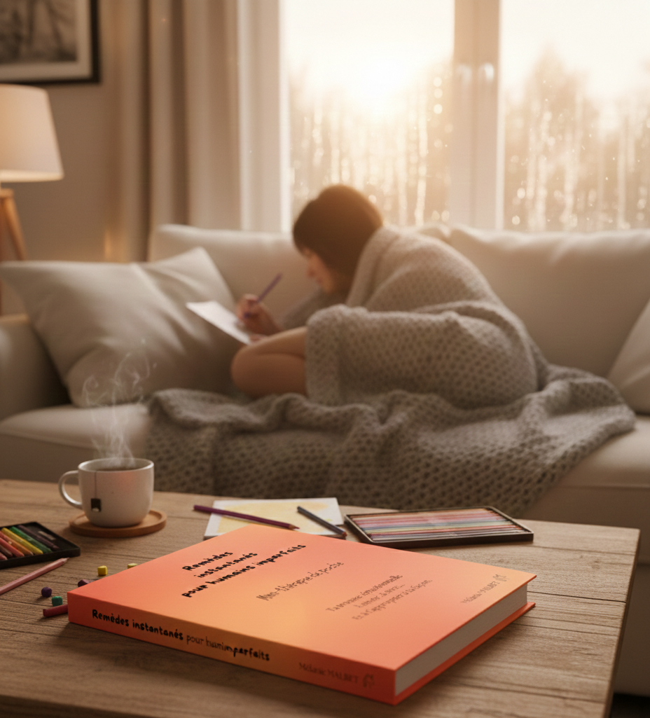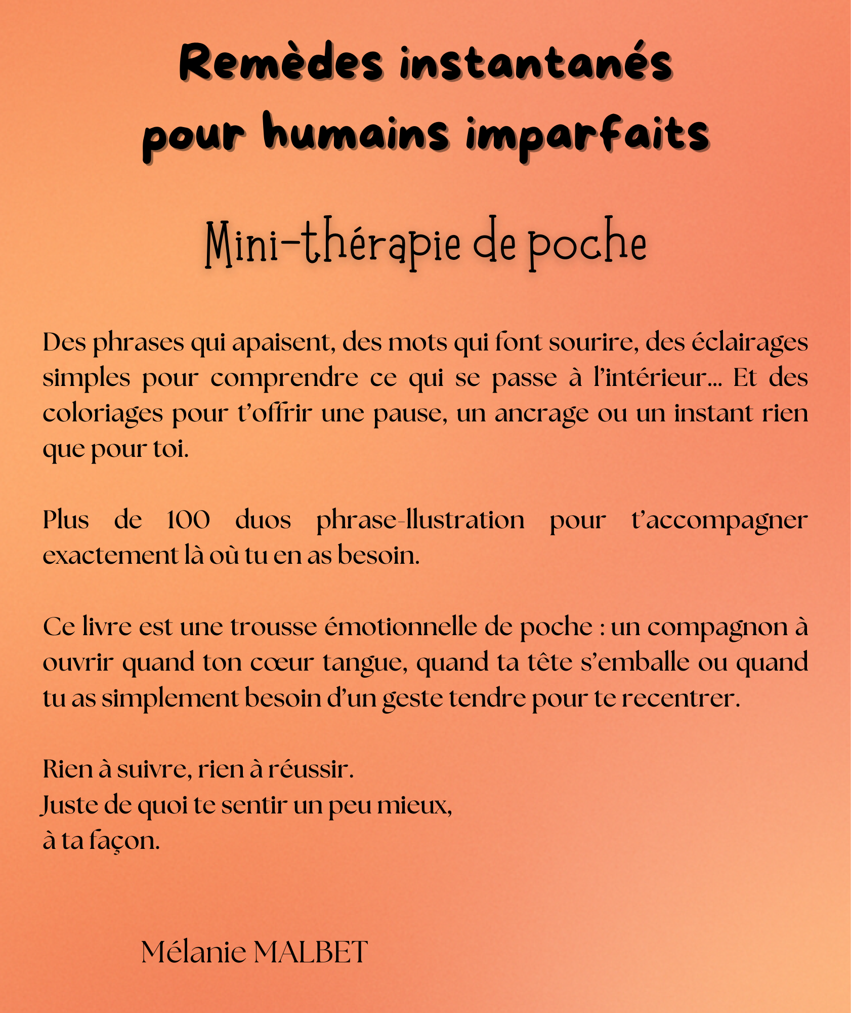 Remèdes instantanés pour humains imparfaits est un livre conçu comme une mini-thérapie de poche : chaque page offre une phrase qui apaise, une image qui respire, et un temps suspendu pour revenir à toi.